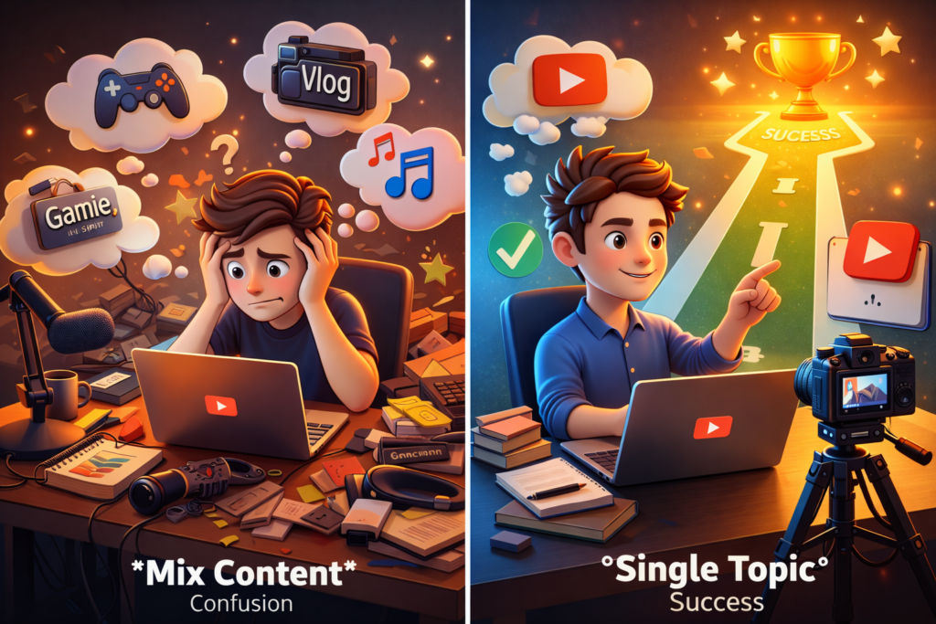 सबसे बड़ी गलती जो एक नया क्रिएटर करता है, वह है हर तरह का कंटेंट बनाने की कोशिश। आज क्रिकेट पर वीडियो, कल किसी मोबाइल का रिव्यू और परसों घर की रेसिपी। देखने में यह बहुमुखी प्रतिभा लग सकती है, लेकिन यूट्यूब के एल्गोरिदम (Algorithm) के लिए यह एक बड़ा भ्रम पैदा कर देती है।